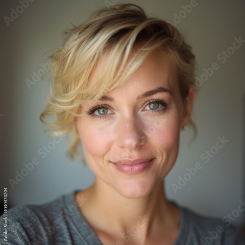 Close-up portrait of smiling blonde woman with short wavy hair and green eyes
