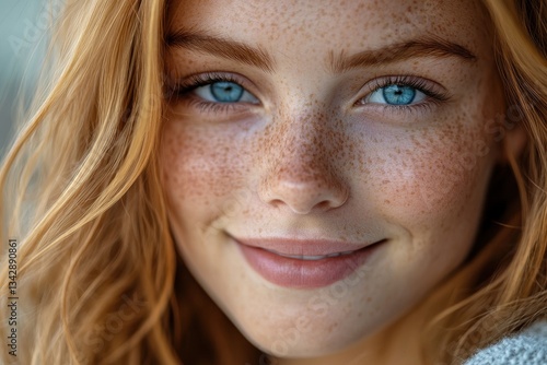 Close-up portrait of smiling red-haired woman with bright blue eyes and freckles. Use for beauty products, skin care, or portraying authentic natural beauty.