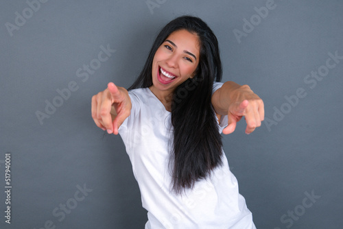 Close-up portrait of surprised young beautiful brunette woman wearing white t-shirt over grey background pointing with two fingers to the camera saying: I choose you!, looking up with open mouth.