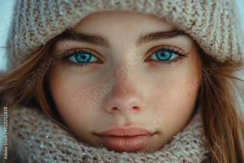 Close-up portrait of teenager wearing winter clothes showing intense blue eyes