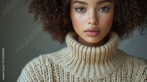 Close-up portrait of woman in beige turtleneck sweater, neutral background