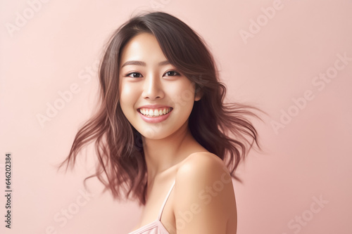 Close-up portrait of woman nice attractive lovely pretty cheerful cheery glad wavy-haired girl folded arms isolated over nude pastel color background. Generative AI.