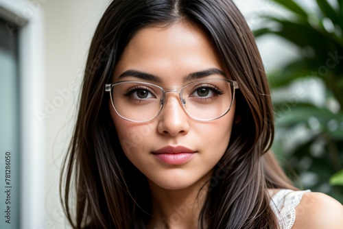 Close-up portrait of woman wearing glasses, vision impairment concept