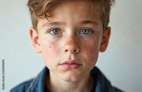 Close-up portrait of young caucasian boy with freckles. Child with blue eyes, casual wear shirt. Face expression, childhood concept. Ideal for topics like summer, skincare products, kids fashion,