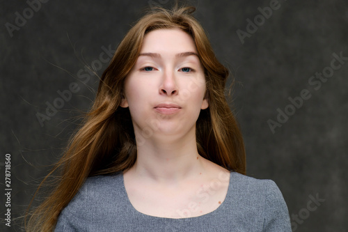 Close-up portrait of young pretty brunette girl woman with beautiful long hair on gray background in gray dress. He talks, smiles, shows his hands with emotions in various poses.
