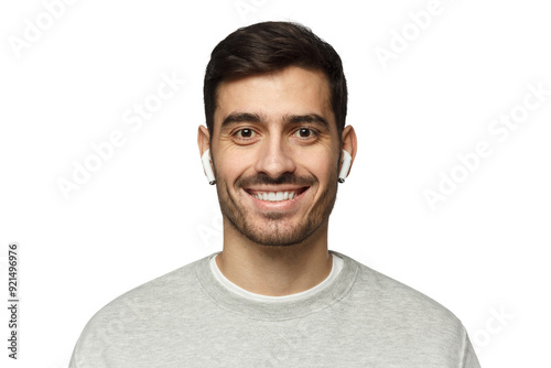 Close-up portrait of young smiling handsome man with earphones
