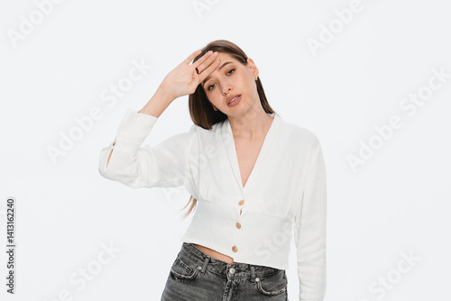 Closeup portrait of young woman lady worried having high blood pressure, suffering from headache migraine massaging temples in period illness, feeling stress isolated on white background copy space