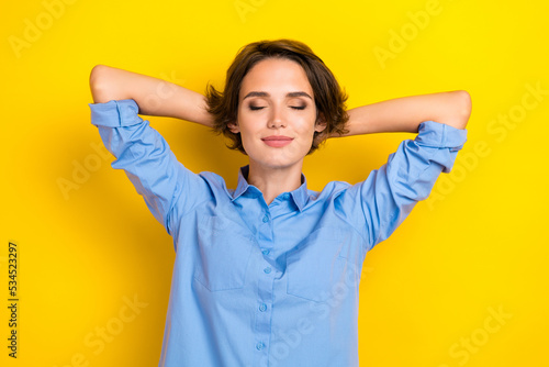 Closeup portrait photo of young adorable cute businesswoman dreaming hands behind head pause relax isolated on bright yellow color background