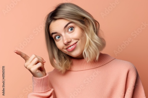 Close-up portrait photography of a glad girl in her 20s making a i have an idea gesture with a finger up against a coral pink background. With generative AI technology