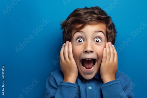 Close-up portrait photography of a happy kid male making a surprise gesture by covering one's mouth against a periwinkle blue background. With generative AI technology