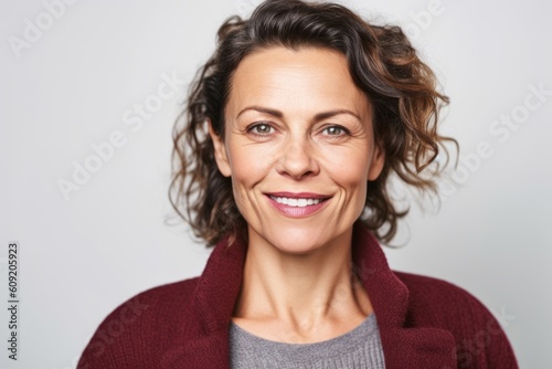 Close-up portrait photography of a pleased woman in her 40s that is wearing a chic cardigan against a white background . Generative AI