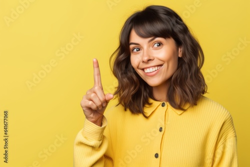 Close-up portrait photography of a satisfied girl in her 30s raising a finger as if having an idea against a pastel yellow background. With generative AI technology