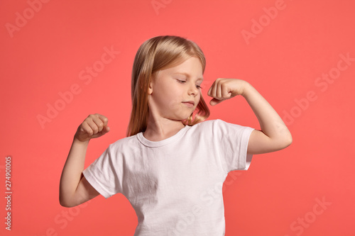 Close-up studio shot of a nice blonde little girl in a white t-shirt posing against a pink background.
