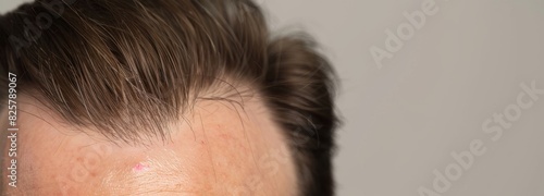 Close-Up View of Male Forehead and Hairline With Isolated Pimple on Skin