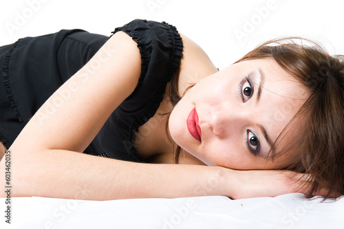 Close-up. Young japanese girl lying on the floor. Beautiful make-up. Isolated
