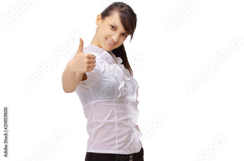 closeup.young business woman showing thumb up.
