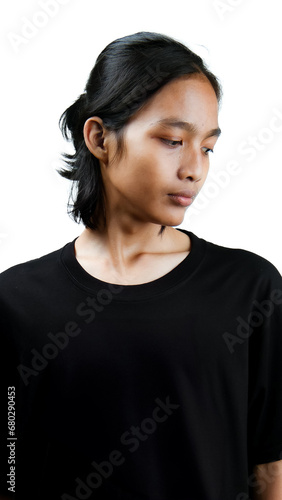 Clothing model. Young Asian man with long curly hair close up shot isolated on white. Asian young man wearing plain black t-shirt isolated on white background. As if he were modeling a plain t-shirt.