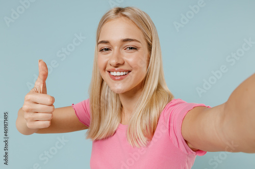 Clsoe up smiling young smiling happy fun blonde woman wearing casual pink t-shirt doing selfie shot pov on mobile phone show thumb up isolated on plain pastel light blue background studio portrait