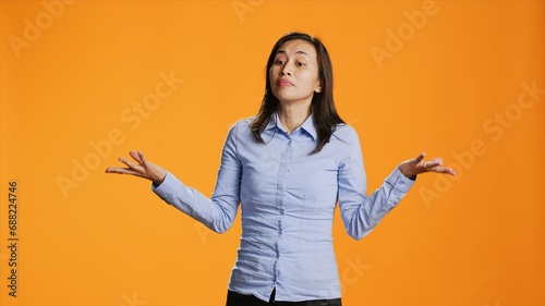 Clueless person raising shoulders on camera, expressing doubt and being uncertain about answer. Young asian woman acting unsure and confused standing against orange background.