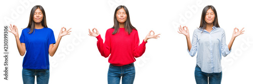 Collage of asian young woman standing over white isolated background relax and smiling with eyes closed doing meditation gesture with fingers. Yoga concept.