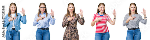 Collage of beautiful middle age woman over isolated background Swearing with hand on chest and open palm, making a loyalty promise oath