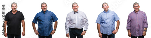 Collage of senior hoary man over white isolated backgroud with a happy and cool smile on face. Lucky person.