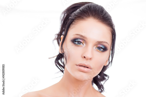 Colorful make-up woman face, beautiful brunette summer makeup, beauty fashion girl model with pink lips