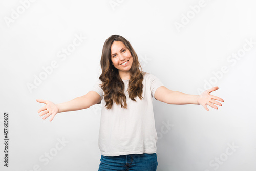 Come here I will give you a hug. Portrait of a woman with arms wide open over white background.