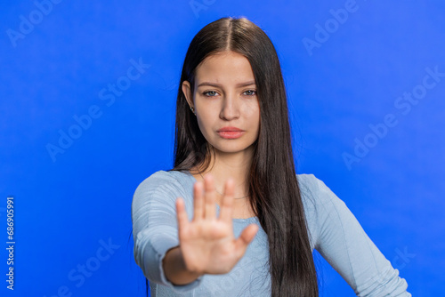 Come here, join us. Welcome. Brunette attractive woman showing inviting gesture with hands, ask to join, beckoning to coming, gesturing hello, goodbye. Strict girl isolated on blue studio background