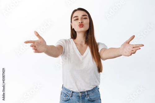 Come into my arms. Beautiful romantic girl kissing and stretching hands, reaching forward to hold you, embracing friend or lover, going to kiss person and hug, standing over white background