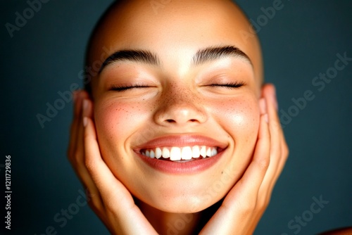 Commercial ad campaign conceptual art. Short hairdo - bald head - no hair. Gorgeous smiling mixed-race girl - for ads, advertisement and online promotion banner use. Commercial beauty model.
