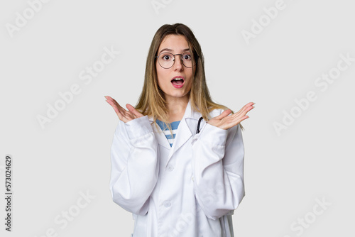 Compassionate female physician with a stethoscope around her neck, ready to diagnose and care for her patients in her signature white coat surprised and shocked.
