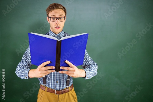 Composite image of geeky businessman reading a book