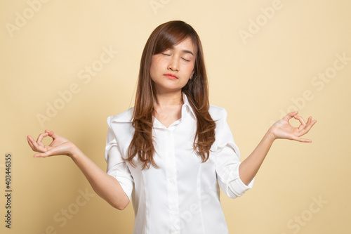 Concentrated relaxed asian female closed eyes, having relaxation while meditating..