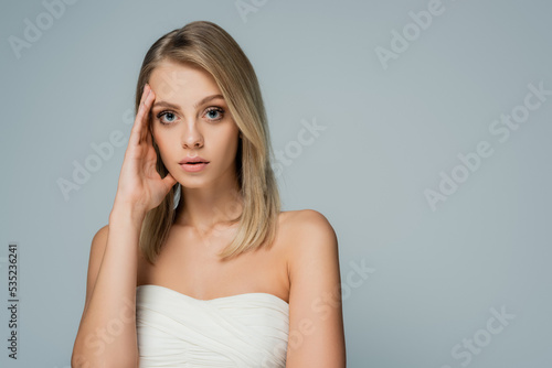 concentrated woman with bare shoulders and natural makeup looking at camera isolated on grey.