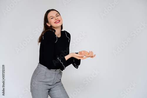 Concept adult girl on a white background. A photo of a pretty brunette girl in gray trousers and a black sweater smiles and shows different emotions in different poses right in front of the camera.