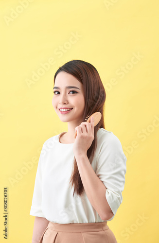 Concept of healthy good hair. Pretty beautiful charming woman with beaming smile