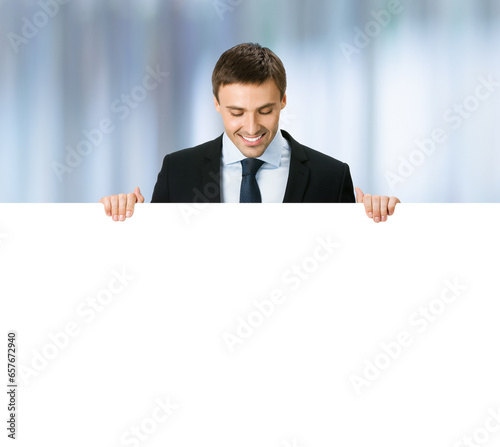 Concept photo - business man professional manager in confident suit. Businessman stand behind hang over, look at empty white banner signboard with copy space. Blurred office background