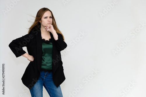 Concept portrait above the knee of a pretty girl, a young woman with long beautiful brown hair and a black jacket and blue jeans on a white background. In studio in different poses showing emotions.