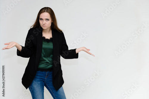 Concept portrait above the knee of a pretty girl, a young woman with long beautiful brown hair and a black jacket and blue jeans on a white background. In studio in different poses showing emotions.