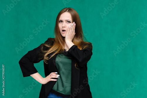 Concept portrait for a belt of a pretty girl, young woman with beautiful brown hair and in a black jacket and green T-shirt on a green background. In the studio in different poses showing emotions.