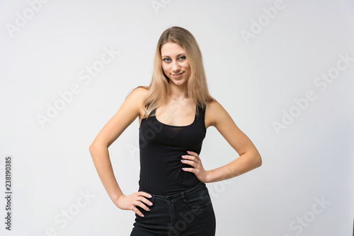 Concept portrait of a beautiful blonde girl smiling on a white background advertises product. She is right in front of the camera and shows different emotions.