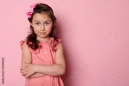 Conceptual emotional portrait of a beautiful lovely child with rose flowers in hair, dressed in stylish pink dress, looking at camera, posing with arms folded over pink isolated background. Copy space