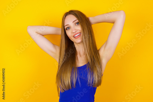 Confidence and coquettish concept. Portrait of charming young business girl, smiling broadly with self-assured expression while holding hands over her head. Standing against background.