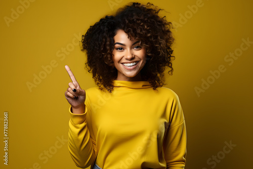 Confident 30-Year-Old Woman: Promotional Pose, Vibrant Yellow Backdrop.