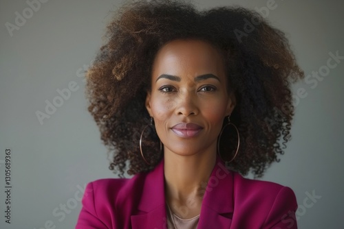 Confident African American woman with curly hair, wearing a bold pink blazer, exuding professionalism and poise.