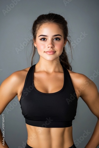 Confident and Empowered Female Model Showcasing Strength and Athleticism in Professional Photography Studio