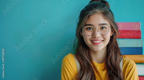 Confident and Ready: A bright young woman with a warm smile and glasses stands confidently in front of a vibrant blue wall with a stack of colorful books