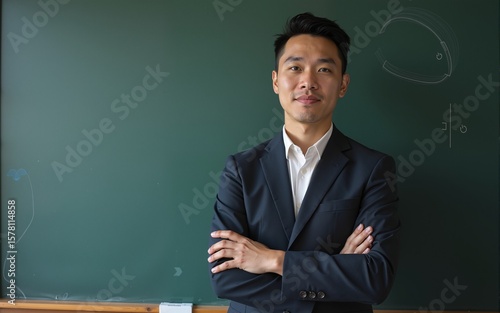 Confident Asian businessman standing in front of a blank chalkboard. High quality