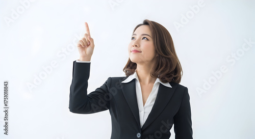 Confident Asian businesswoman in a sleek suit pointing upwards a bright future success career growth leadership innovation motivation achievement progress aiming upwards